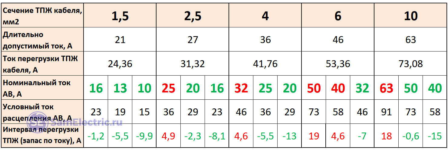 Таблица по оптимальному выбору автоматов под разные номиналы сечений кабеля: