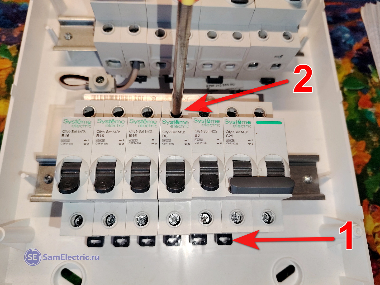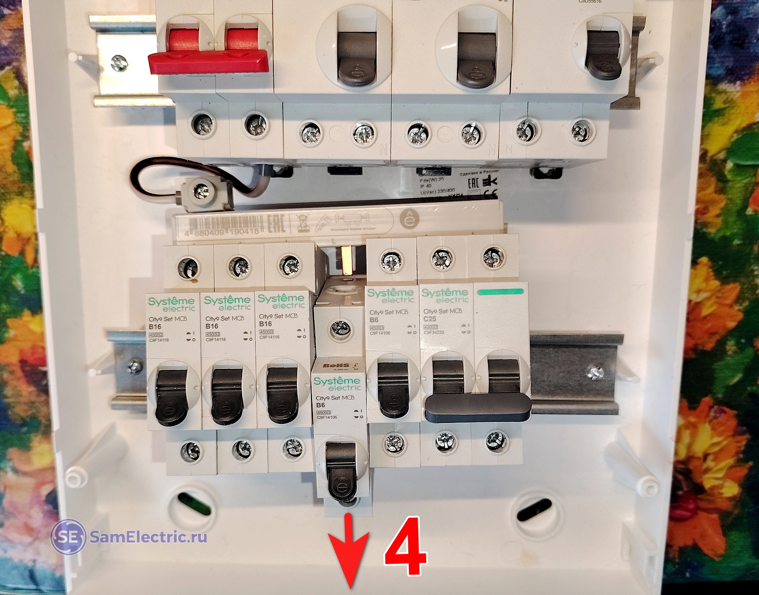 Допустим, нам нужно снять с монтажной рейки 4-й автомат (В6). Делается это за 4 шага: