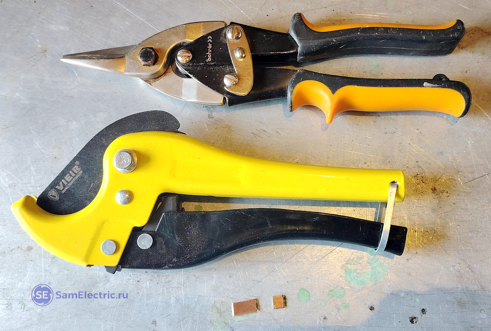 - Далее режем металл, понадобится инструмент. Многие используют ножовку по металлу или даже болгарку. Считаю, это непрофессионально – много шума и пыли, и нужно дорабатывать напильником, поскольку остаются заусенцы. Рекомендую использовать ножницы по металлу или кабелерез.
