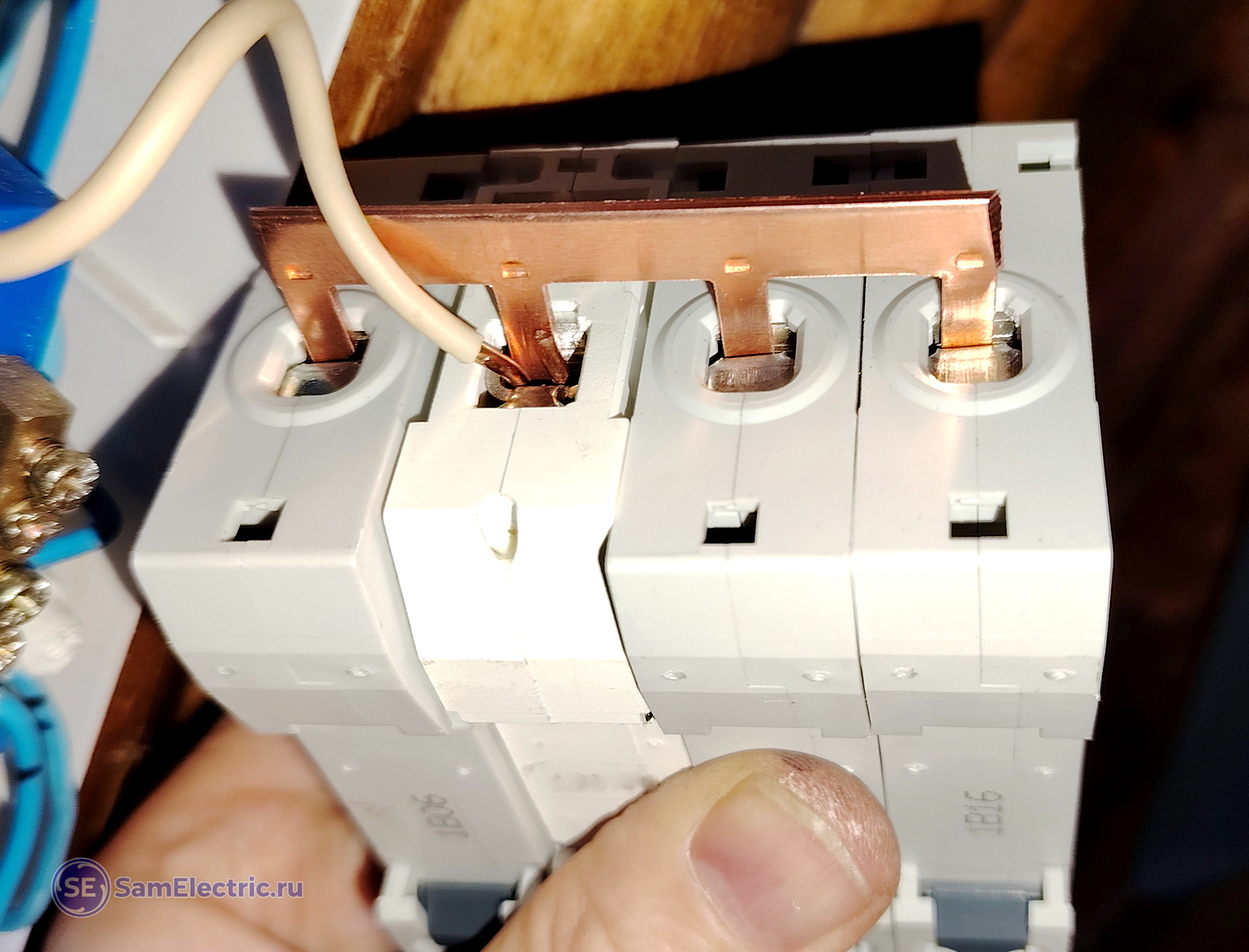 Приведу фото установки соединительной шины из моей статьи про сборку бюджетного безопасного щита в квартиру: