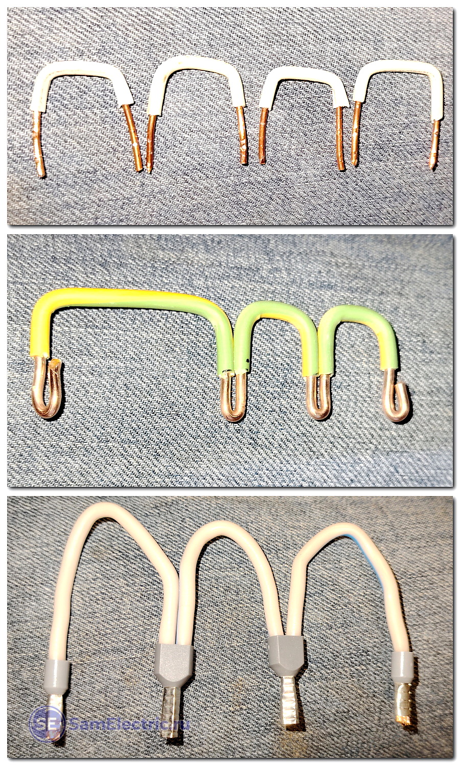 - Если применяются отрезки жил, как на первом фото, нужно строго следить за их диаметром. Жилы даже одного номинала и одного производителя, но разных партий могут иметь отличия в диаметре на несколько сотых миллиметра. А значит – неизбежно будет разный зажим, разное переходное сопротивление и разный нагрев.