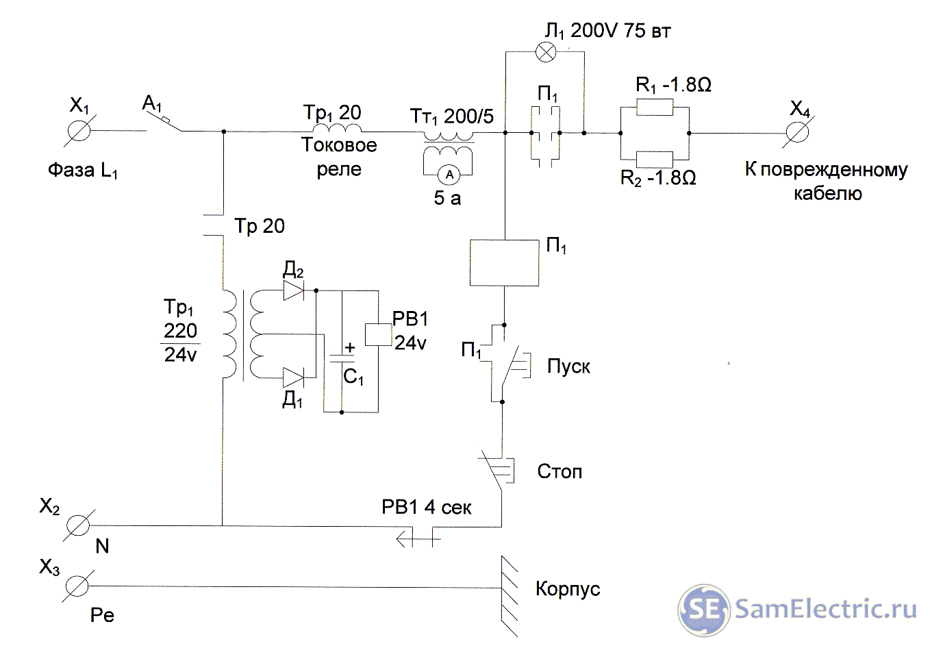 Место «пробоя» кабеля жила – жила имеет сопротивление изоляции в пределах 500…100 кОм. Для более точного определения места повреждения применяются приборы типа Р5-10, Р5-13 и др. и звуковой генератор и кабельный искатель. Но для нормальной работы поисковых приборов нужно снизить сопротивление изоляции кабеля до значений 10…2 ома. Для снижения сопротивления необходимо кабель «дожечь». Для этого применяется приборы типа УП-7, «феник» и др. которых бывает и нет в наличии.